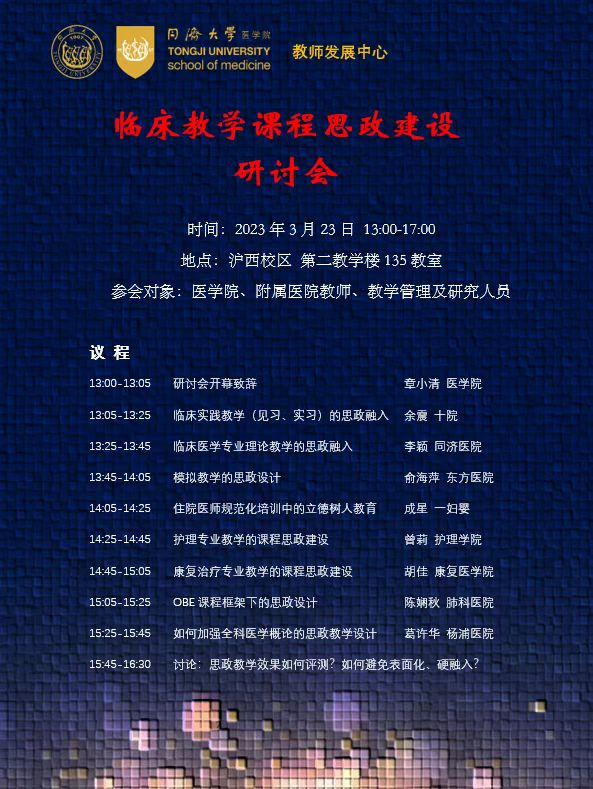 为贯彻执行教育部《高等学校课程思政建设指导纲要》,推进我院临床教学的课程思政建设,学院定于2023年3月23日举办临床教学课程思政建设研讨会,分享各临床单位课程思政建设的阶段性进展,通过研讨共性问题,寻求解决和改进办法,进一步提升教师的课程思政教学能力和单位的课程思政教学水平。研讨会拟从临床理论课教学、实践教学各环节及毕业后教育(规培)等方面研讨专业教学融合课程思政的实践探索、经验与不足、成效等。