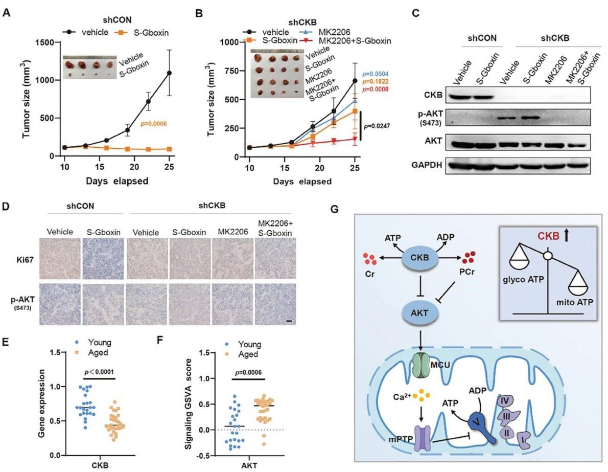 研究表明肌酸激酶CKB通过抑制AKT活性进一步抑制线粒体钙离子水平降低,因此减少糖酵解产生的ATP,从而阻止线粒体通透性转换孔mPTP的激活,并确保高效生成线粒体ATP。