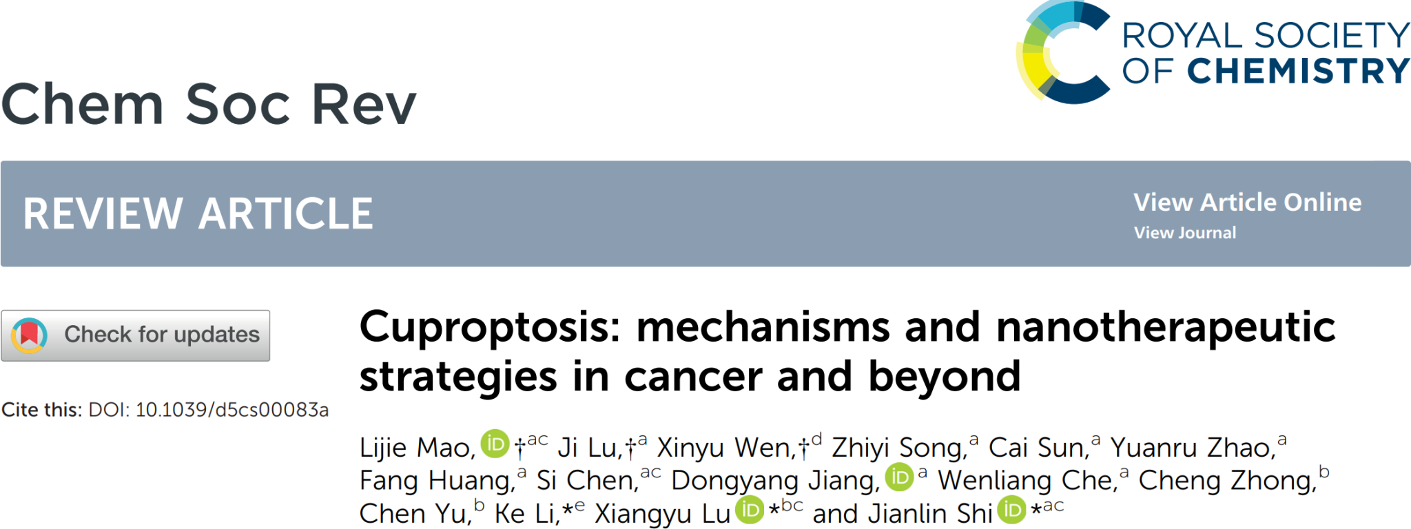 近日,pg游戏电子模拟器逯向雨、毛丽杰、施剑林院士等人于生物医学工程领域取得重要进展,在国际顶级期刊Chemical Society Reviews(影响因子IF=40.6)发表题为 “Cuproptosis: mechanisms and nanotherapeutic strategies in cancer and beyond”的涉及生物学、医学、药学和化学等领域的交叉性学术论文,系统阐述了铜死亡纳米医学的研究进展与未来图景,为后续利用铜死亡治疗各种重大疾病奠定了基础。
