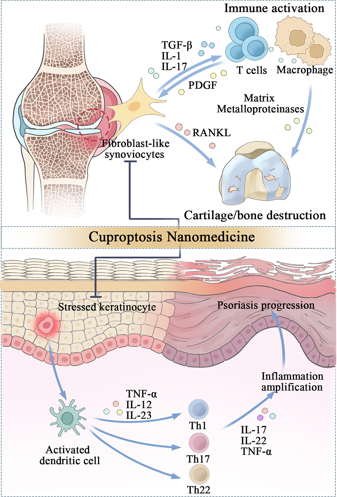 图 7:纳米铜死亡的潜在治疗应用。在抗菌治疗中,铜离子通过破坏细菌能量代谢核心(线粒体),诱导细菌呈现类铜死亡机制的线粒体损伤,为感染相关的创面治疗及骨组织修复提供抗感染与促再生协同效应;针对自身免疫疾病,通过精准识别并作用于异常增殖的免疫细胞(如类风湿关节炎种异常活化的成纤维样滑膜细胞、银屑病中抗凋亡的角质形成细胞),诱导铜死亡以清除过度活化细胞,重塑免疫细胞亚群平衡、调控免疫稳态。
