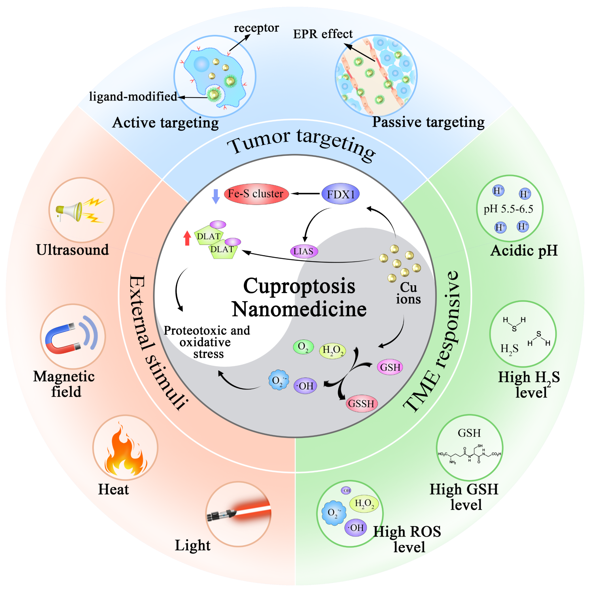 图 5:提高纳米铜死亡特异性肿瘤治疗的策略。从纳米材料设计视角,系统阐述增强铜死亡特异性治疗的多种策略:一、优化靶向效率,通过精准调控纳米材料尺寸以利用增强渗透与滞留(EPR)效应实现被动靶向,或在材料表面修饰肿瘤特异性配体,借助受体–配体特异性识别机制实现主动靶向,提升铜基纳米材料向肿瘤部位的递送精准性;二、构建外源性刺激响应体系,利用超声、磁场、热、光等物理刺激,触发纳米材料响应性释放铜离子,并避免正常组织暴露;其三、开发内源性肿瘤微环境(TME)响应体系,基于肿瘤微环境特征性的酸性pH、高硫化氢(H₂S)水平、高谷胱甘肽(GSH)及高活性氧(ROS)水平,设计TME响应型纳米材料,实现铜基纳米材料在肿瘤区域的智能释放与精准激活。