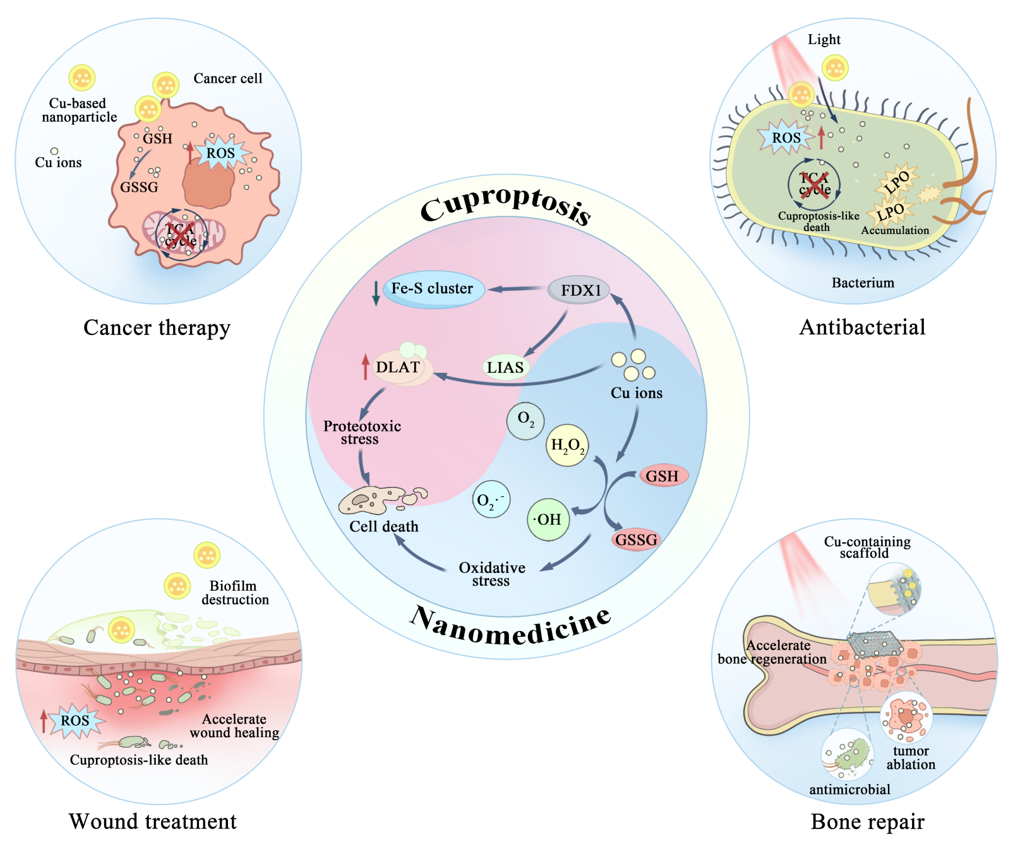 图 1:铜死亡纳米医学的机制及生物医学应用。纳米铜死亡以铜离子介导的线粒体蛋白毒性应激与氧化应激为核心机制,在肿瘤治疗、抗菌、伤口治疗和骨修复中具有独特的调控作用。