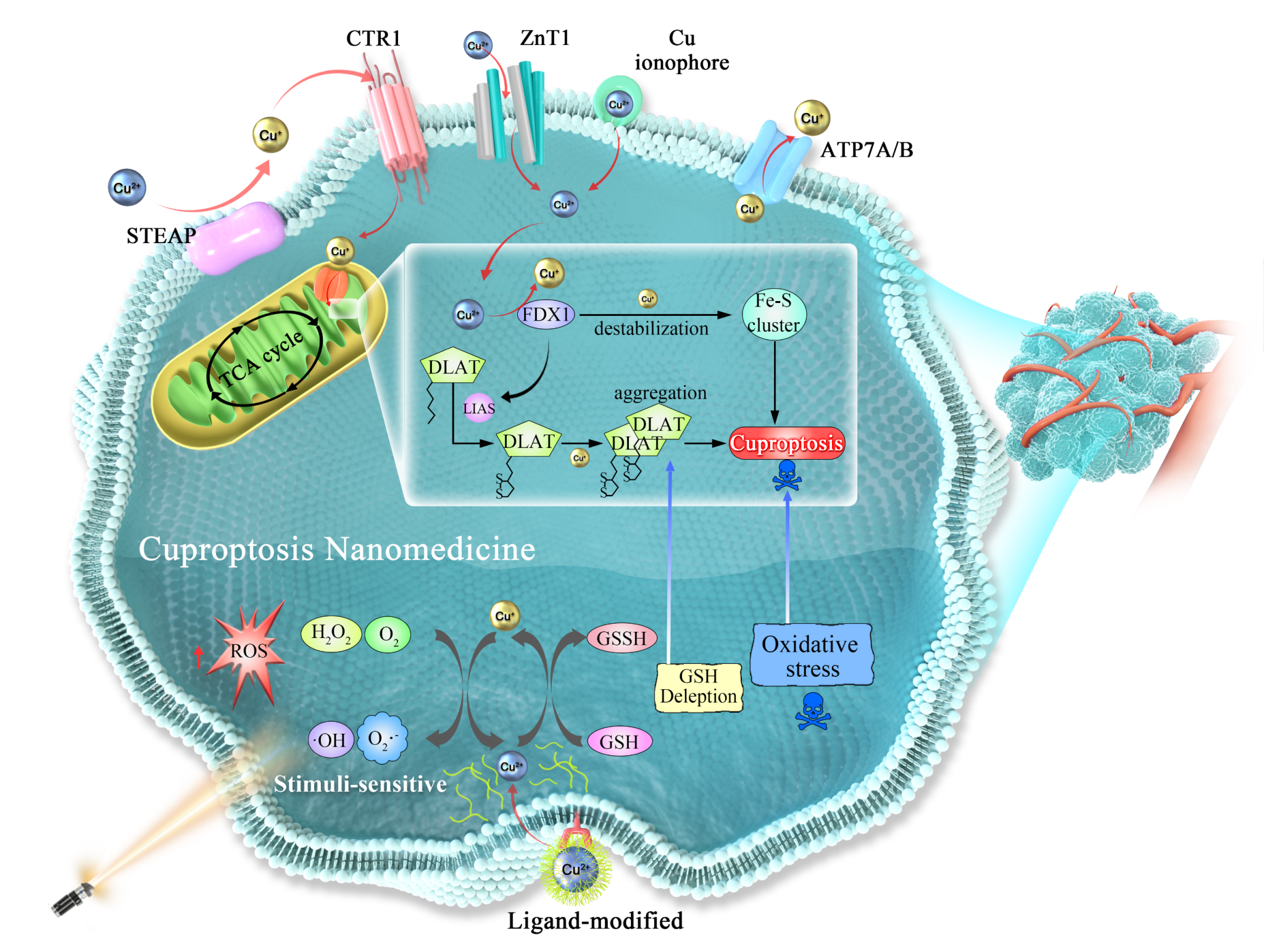 图 3:铜死亡纳米医学的生物化学机制。纳米铜死亡涉及线粒体蛋白毒性应激和氧化应激的协同作用。在线粒体蛋白毒性应激通路中,铜离子通过CTR1(铜转运蛋白)/ZnT1(锌转运蛋白)跨膜转运系统,或借助铜离子载体(如DSF/Cu)进入细胞,胞内Cu2+在线粒体中被FDX1还原为Cu+,并直接与脂酰化DLAT相结合,导致脂酰化蛋白寡聚化和Fe-S簇蛋白失稳,最终引发细胞线粒体功能紊乱和铜死亡。在氧化应激协同机制中,纳米材料通过靶向递送或响应性释放实现铜离子在肿瘤细胞内的特异性富集,并凭借其氧化还原活性催化Fenton-like反应,产生活性氧(ROS),加剧肿瘤细胞内氧化应激状态,或通过消耗谷胱甘肽(GSH)敏化线粒体蛋白毒性应激。这种蛋白毒性应激与氧化应激的双重损伤机制,通过纳米载体的精准调控得以协同增强,从而显著提升铜死亡效率及肿瘤治疗特异性。