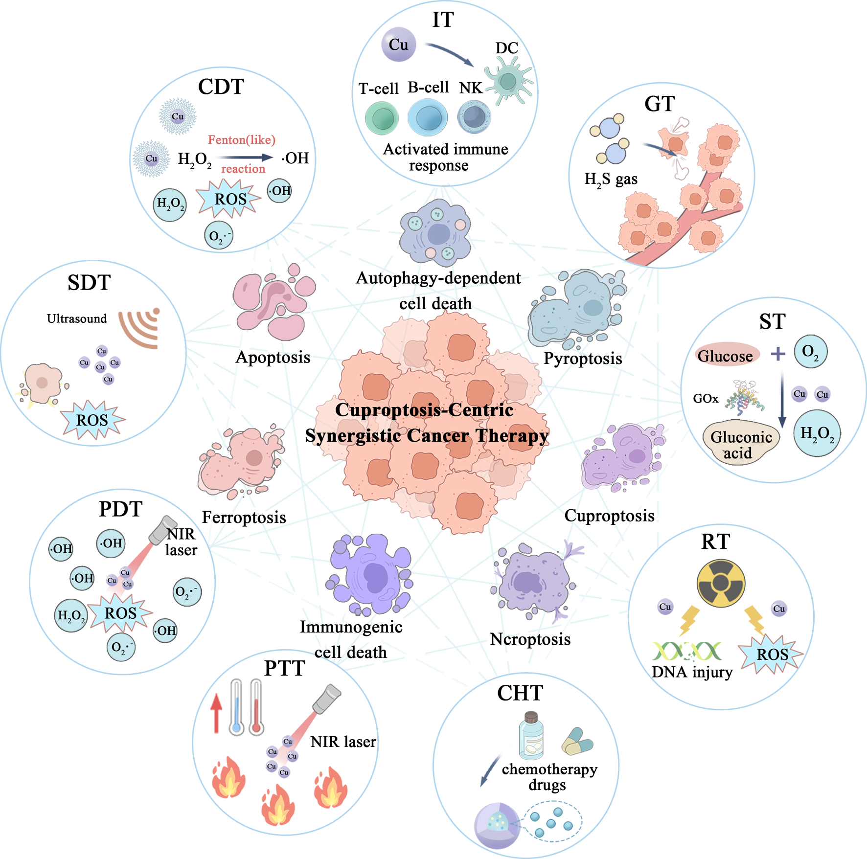 图 6:铜死亡介导的肿瘤协同治疗策略。通过将铜死亡与免疫疗法(IT)、气体疗法(GT)、饥饿疗法(ST)、化疗动力学疗法(CDT)、光动力疗法(PDT)、光热疗法(PTT)、声动力疗法(SDT)、化疗(CHT)及放射疗法(RT)等新兴治疗模式相整合,借助不同疗法独特的作用机制,如诱导活性氧(ROS)生成、调控细胞死亡类型(自噬、焦亡、坏死等)或激活免疫应答,构建多维度协同抗肿瘤效应,为肿瘤治疗提供了丰富且极具潜力的治疗路径 。