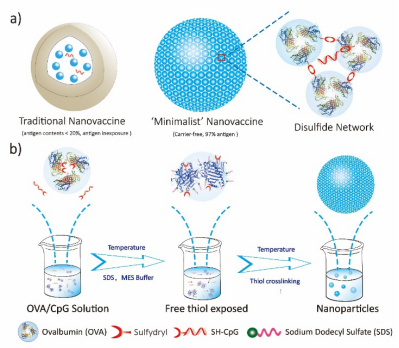 该研究,选取常见的卵清蛋白(OVA)为模型抗原,利用蛋白质特有的化学结构特点,创新性发展一种“调控巯基暴露+二硫键交联”新型策略,在不使用任何传统纳米载体的情况下,介导>500个 抗原分子在纳米尺度上“手牵手”,形成稳定二硫键空间网络结构,构筑得到一种成分 “最简化”的新型纳米疫苗(近于100%抗原组成)。整个方法快速、绿色、尺寸高度可控,且对其他蛋白具有较好的普适性。