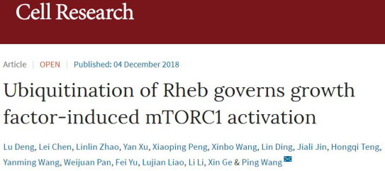 近日,王平课题组在Cell Research杂志上发表了题为Ubiquitination of Rheb governs growth factor-induced mTORC1 activation的研究论文,该文阐述了泛素化修饰能够通过Rheb参与到mTORC1感应微环境中的生长因子信号。