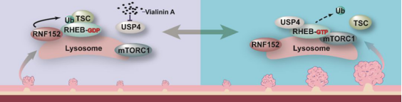 泛素化修饰作为一种翻译后修饰,它能够调控底物的稳定性、活性或者是定位,该研究发现Rheb的泛素化修饰不会影响Rheb的蛋白稳定性。通过检测MEF中RNF152和USP4的活性,发现泛素化修饰能够抑制Rheb的小G蛋白酶活性。进一步的研究发现,该泛素化修饰主要是通过促进Rheb与TSC2结合进而抑制Rheb的小G蛋白酶活性。