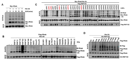 Rheb作为mTORC1的直接激活者,对于mTORC1的激活起着关键的作用【13】。该研究发现Rheb不仅可以被泛素化修饰,而且它的泛素化修饰还受生长因子信号的调控,通过筛选鉴定了它的E3泛素连接酶RNF152,去泛素化酶USP4,以及泛素化位点K8(下图)。
