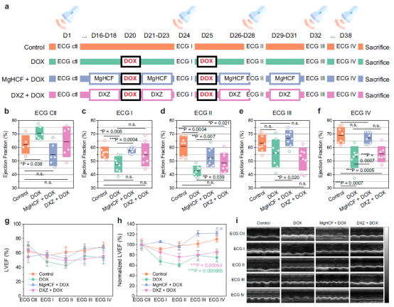 随后,研究团队探究了对于铁氰酸镁纳米催化剂及右雷佐生药物在防护给药模式下的小鼠心功能在体检测。在长约38天的检测日程中,研究人员对小鼠按日程进行了多次防护给药及急性心肌毒性建模处理,并在特定的时间点进行心超检测,监控其心脏功能。通过心脏超声的M超模式,测量并计算小鼠射血分数值EF作为其心功能的重要监察指标。研究发现,小鼠进行高剂量阿霉素药物的处理后,其射血分数值均有显著的下降,DOX药物处理组的平均EF值跌至50%以下,预示着较为衰弱的心脏射血功能,而经过3天防护性处理的小鼠(铁氰酸镁组或DXZ组),其心脏射血功能值能够维持相对的稳定,第二周期DOX药物处理后,DOX组小鼠显得较为虚弱,其心脏射血分数进一步降低,虽然铁氰酸镁组及DXZ组均有一定程度的下降,但在随后的心肌检查中,其EF值逐渐恢复至正常水平。研究人员对各组EF值进行了归一化处理,以更加真实反应各组小鼠抵抗DOX药物损伤的能力。研究发现,DOX处理组小鼠其EF在受激下降后,一直处于一个较低的相对水平,相较于DXZ药物防护组,铁氰酸镁防护组在整体考察周期内展示出更加优异的心肌防护水平(图4)。