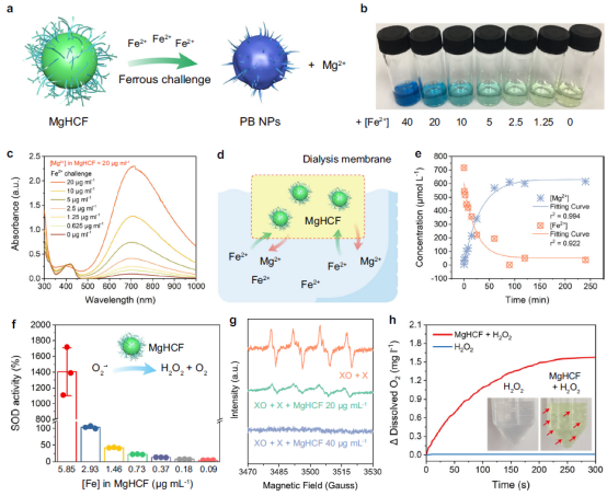 研究团队对所制备的铁氰酸镁纳米催化剂在溶液层面采用自由扩散的方法及半透膜限制的方法验证了其对Fe2+的高效捕获及离子交换化学反应性能。进一步研究团队采用超氧化物歧化酶试剂盒、电子自旋共振以及溶氧仪手段表征铁氰酸镁纳米催化剂在不同自由基物种下的类超氧化物歧化酶性能及类过氧化氢酶性能,高效分解超氧阴离子及过氧化氢,展现出了优异的抗氧化性能(图2)。