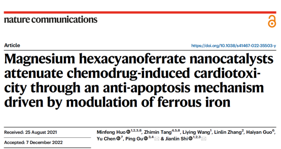 2022年12月15日,pg游戏电子模拟器施剑林院士研究团队在《自然 通讯》(Nature Communications)期刊上发表了题为“Magnesium hexacyanoferrate nanocatalysts attenuate chemodrug-induced cardiotoxicity through an anti-apoptosis mechanism driven by modulation of ferrous iron”的研究论文。