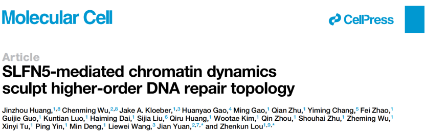 2月27日,pg游戏电子模拟器袁健教授团队联合美国梅奥医学中心楼振昆团队,在《Molecular Cell》杂志在线发表了题为SLFN5-mediated chromatin dynamics sculpt higher-order DNA repair topology的文章。黄金舟博士和同济的吴晨明博士作为共同第一作者。