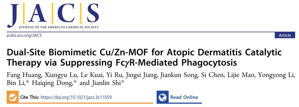 1月24日,中国科学院院士施剑林院士、逯向雨助理教授、李斌教授、董海青副研究员团队在国际顶级期刊《美国化学会志》(Journal of the American Chemical Society)发表题为“Dual-Site Biomimetic Cu/Zn-MOF for Atopic Dermatitis Catalytic Therapy via Suppressing FcγR-Mediated Phagocytosis”的研究论文。该研究模仿天然CuZn-SOD的双金属活性位点,开发出具有ROS清除能力的双位点仿生催化剂Cu/Zn-MOF,可以有效地治疗特应性皮炎。
