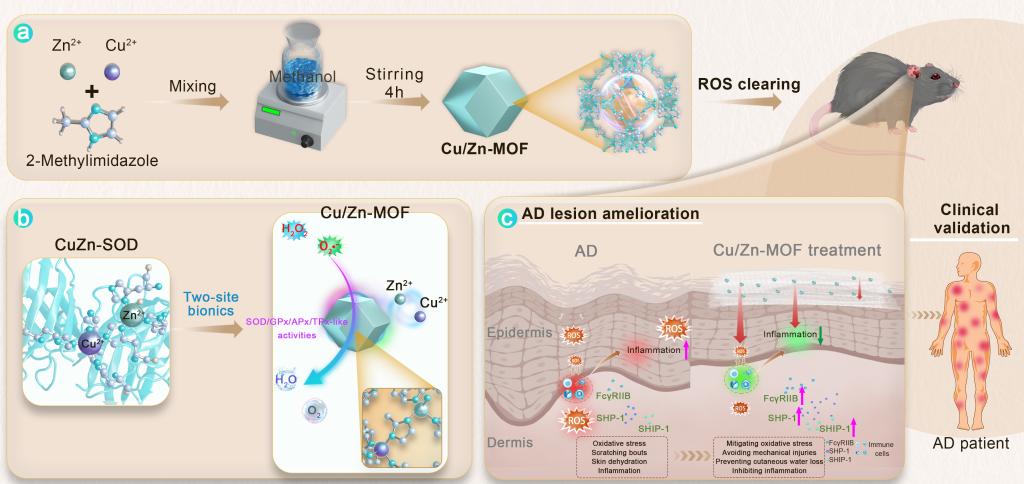 图1.双位点仿生Cu/Zn-MOF用于催化治疗特应性皮炎的示意图