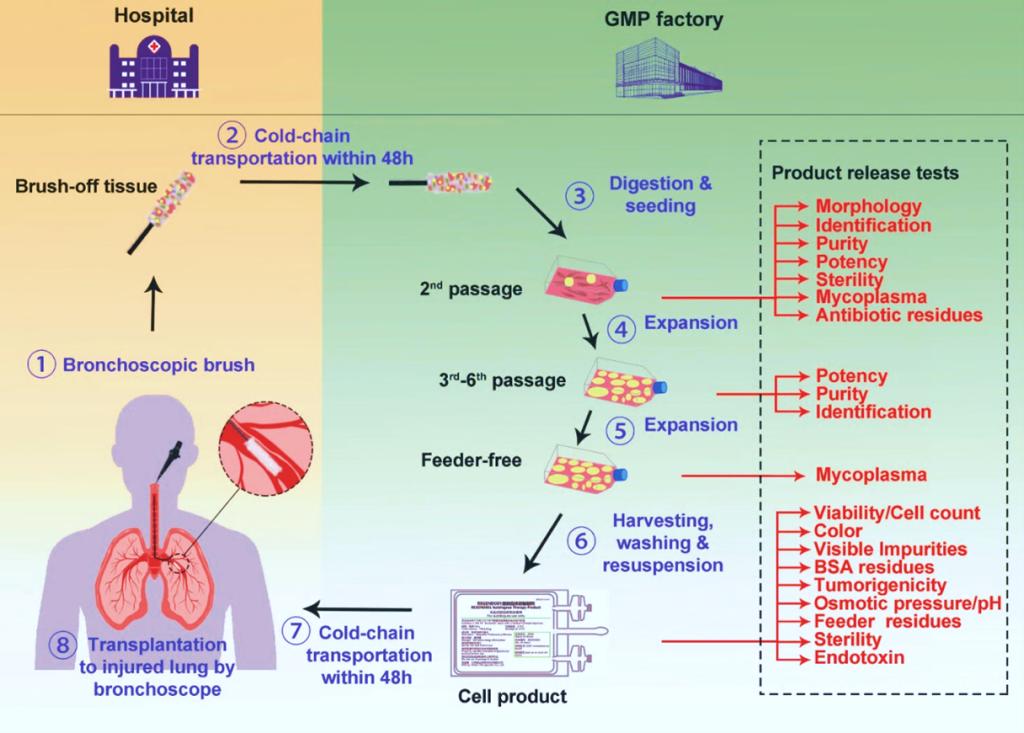 在成人肺部中,存在着多种类型的干细胞(stem cell)和前体细胞(progenitor cell),这些细胞在维持肺部稳态和修复受损肺组织中发挥着重要作用。其中,以P63, KRT5和SOX9为标志的支气管上皮基底层来源的前体细胞备受关注。这些细胞能够响应肺部的大规模损伤、具备具有分化为多种肺部上皮细胞的潜能,直接参与肺泡结构的修复和再生。左为团队开发了人P63+ LPC的分离扩增专利技术R-Clone,并发明了LPC的肺内移植方法,并在啮齿动物和非人灵长类模型均对细胞移植方法和效果进行了充分的验证。在2016年,左为课题组与戴晓天团队合作,在首次成功分离扩增了2例支气管扩张症患者的自体P63+ LPC,并将其用于自体肺内移植治疗。治疗半年后观察到了良好的安全性和对肺功能的显著提升作用(Ma, Protein & Cell, 2018等)。上述研究背景为后续更大规模和更高水平的临床研究奠定了基础。