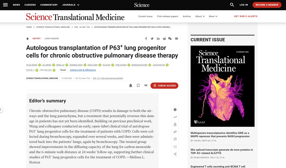 慢性阻塞性肺疾病(Chronic obstructive pulmonary diseases, COPD)是一类重大的肺部损伤性疾病,在全球范围内患病人数数以亿计。病情中度以上的慢阻肺患者生活质量可受到严重影响,而进展为重度和极重度之后,患者往往可因肺脏结构大面积损坏导致呼吸衰竭和心血管并发症而死亡。目前慢阻肺治疗方法主要以减轻气流受限为主,但这些方法主要是对症治疗,未能真正有效地再生修复受损的肺组织或提升肺脏换气功能。针对这一急迫的临床需求, 2月 14日,pg游戏电子模拟器/附属东方医院左为教授团队,与广州医科大学附属第一医院钟南山院士、李时悦教授团队,以及陆军军医大学附属西南医院戴晓天教授合作,在全球顶级转化医学刊物《科学-转化医学》(Science Translational Medicine)杂志发表了题为“Autologous transplantation of P63+ lung progenitor cells for chronic obstructive pulmonary disease therapy(移植自体P63阳性肺前体细胞用于慢性阻塞性肺病的治疗)”的研究论文。论文报道了全球首个P63阳性肺前体细胞 (P63+ LPC) 移植的一期临床安全性及疗效研究结果,以及相关的细胞转录组特征分析,证实P63+ LPC移植具有提升肺换气功能的潜力,为包括慢阻肺在内的各类重大呼吸系统疾病提供了组织再生修复的治疗新思路。