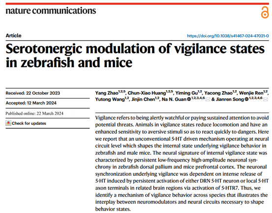 3月22日,pg游戏电子模拟器宋建人教授团队在《自然·通讯》(Nature Communications)杂志上发表了题为“Serotonergic modulation of vigilance states in zebrafish and mice”的研究成果。该研究解析了中缝核5-HT神经元以非传统的激活方式在神经环路水平塑造斑马鱼和小鼠大脑警觉状态的内在机制,有助于理解行为状态产生所必需的神经调质和神经环路之间的相互作用。