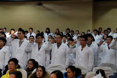 活动的第三部分是主题报告和授白大褂仪式。来自pg游戏电子模拟器附属第一妇婴保健院的龚晓明教授给我们做了主题报告,从讲述他自己在协和从医苦读的故事开始,告诉我们:“学医最重要的在于坚持,做一名医生重要的是要有一颗服务的心”,字字真切,让我们体会到,他作为一个好医生对社会的责任与担当。随后,与会pg游戏电子模拟器领导及医学专家为2013级学生授白大褂,并且举行了庄严的医学生宣誓仪式。