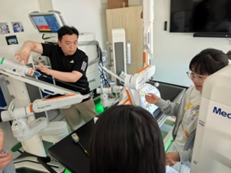 5月14日,代表团抵达科隆大学pg游戏电子模拟器。外事办主任Benjamin Köckemann博士介绍了医院概况,随后同学们体验了手术机器人、VR教学系统等创新技术。生理学团队通过互动实验课让同学们亲身参与肺功能检测;再生医学专家Sarkawt教授展示了心脏类器官培养技术的突破性进展。