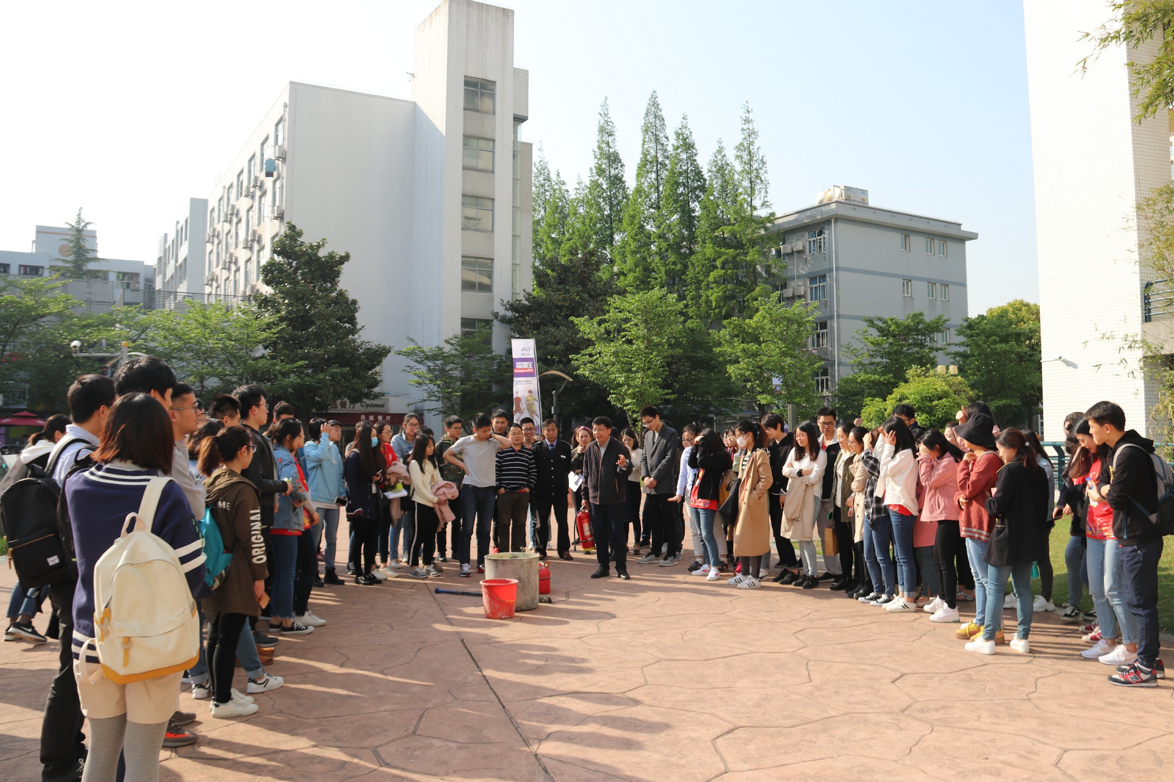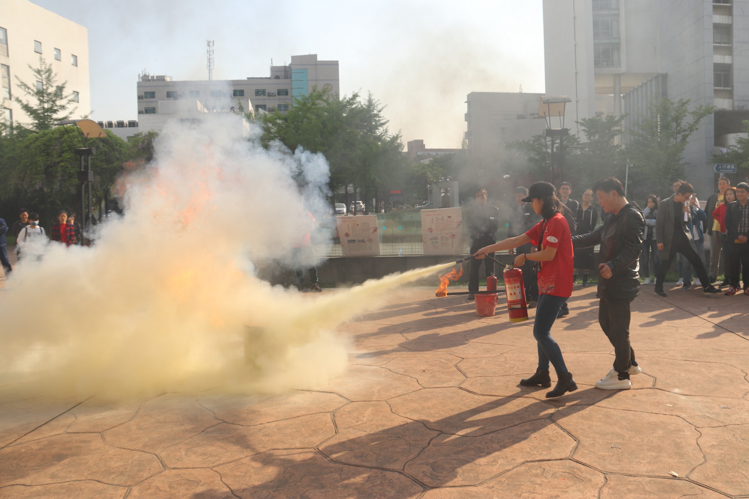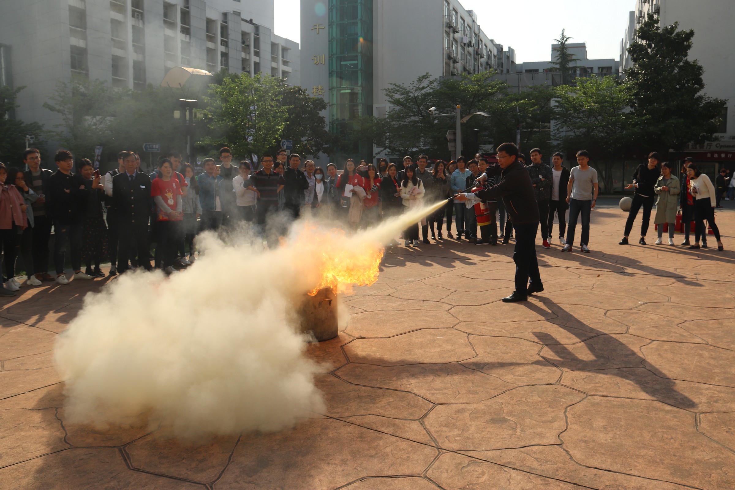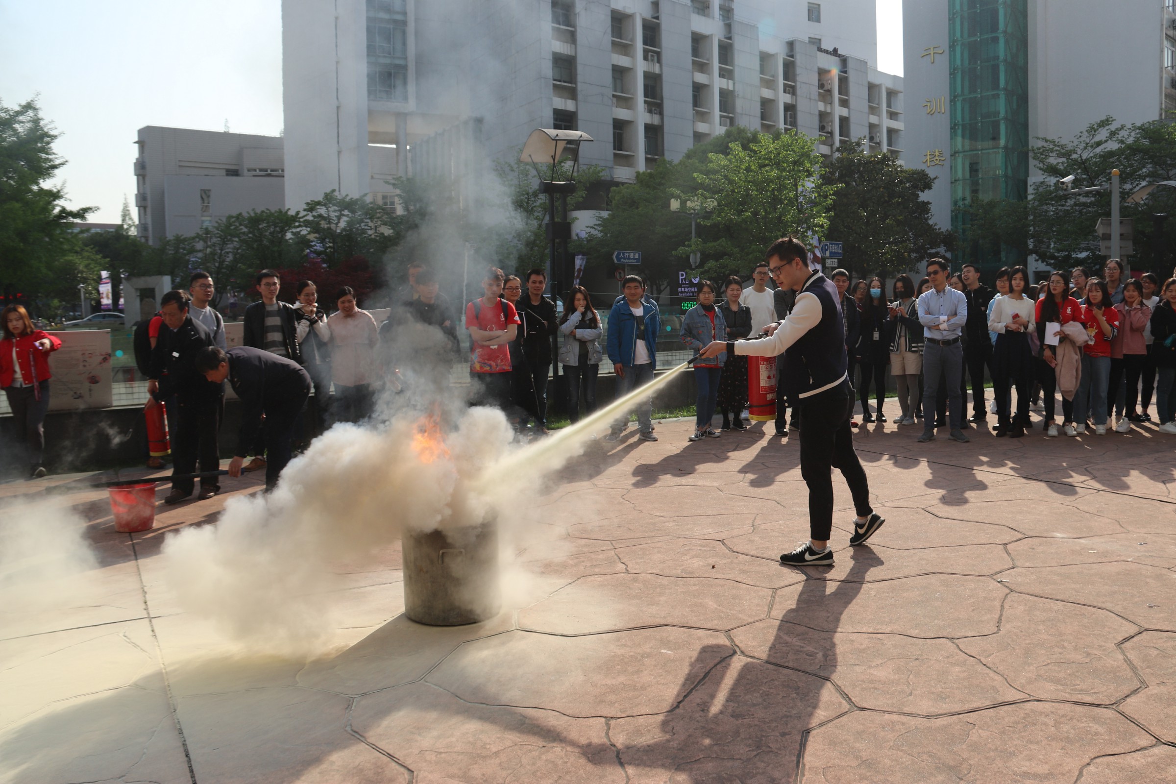 在培训讲座结束后,祝建新老师带领参与讲座培训的同学来到pg游戏电子模拟器前的广场,演示如何正确使用灭火器。他首先介绍了灭火器的构造和正确使用方式,然后现场演示了面对火情时如何正确使用灭火器。同学们纷纷尝试,在现场老师们的指导下学会了使用灭火器。
