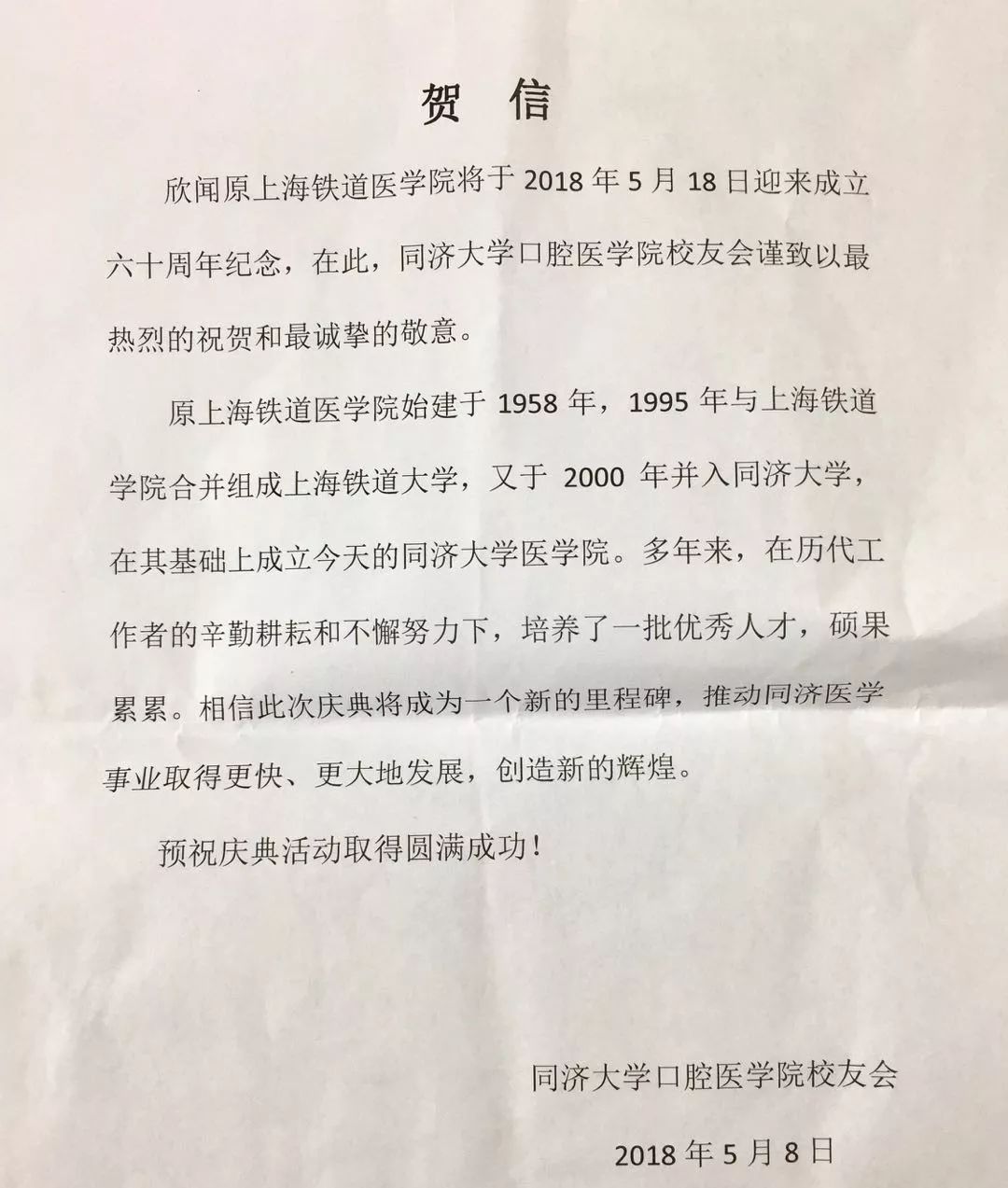 早在5月8日,pg游戏电子模拟器口腔pg游戏电子模拟器校友会便发来了贺信,向上铁医成立60周年纪念致以最热烈的祝贺及最诚挚的敬意,并预祝庆典活动取得圆满成功。因为身体原因,未能到现场的原上海铁道大学党委副书记、上海铁道pg游戏电子模拟器党委书记王文浩和原上铁医副院长汪廷刚,都发来了贺信贺词,对自己无法亲临祝贺及与同事、校友叙旧表达了遗憾,期待下次的院庆相聚,并祝大家身体健康、生活幸福。