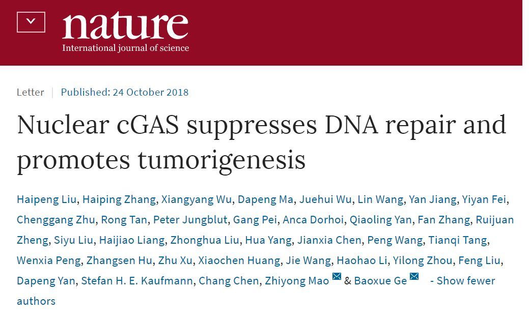 科研人员合作研究发现,cGAS在细胞发生DNA损伤时可转位入细胞核内,并被招募至DNA受损的位点,通过干扰PAPR1/Timeless复合体形成,抑制DNA双链断裂损伤修复,进而增加了基因组的不稳定性并最终增加了肿瘤生成风险。研究还发现,cGAS对DNA修复的抑制作用是一条完全独立于其DNA识别功能的通路。