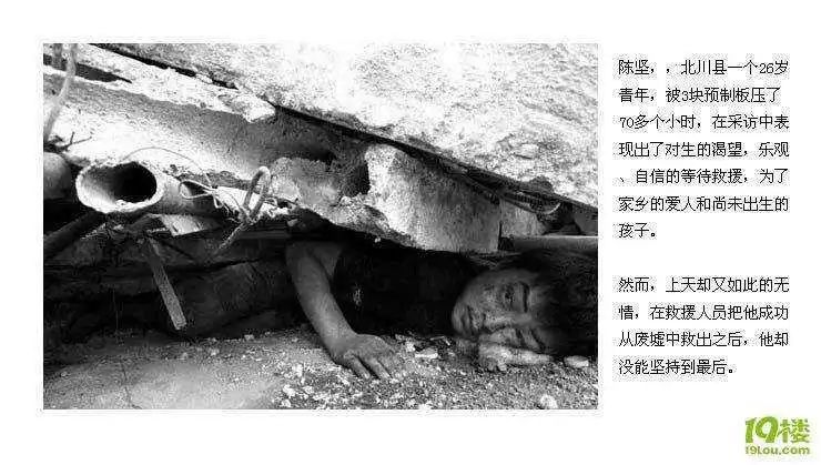央视主持人白岩松报道过这样的例子:26岁的北川打工青年陈坚,被压在废墟下73小时,现场官兵对他进行了6小时大营救,但救出半小时后,电视直播刚一停止,他却在担架上逝去了。