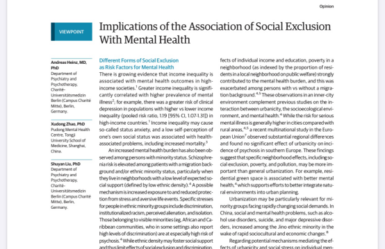 JAMA psychiatry(精神医学领域排名第二的杂志,影响因子IF=15.92)于2019年10月9日在线发表了题为“Implications of the Association of Social Exclusion With Mental Health”的文章 ,这篇特约“观点”专栏文章由pg游戏电子模拟器赵旭东教授同德国柏林夏丽特大学Andreas Heinz教授、Shuyan Liu博士共同完成,是新成立的pg游戏电子模拟器中德精神卫生研究所的合作成果。