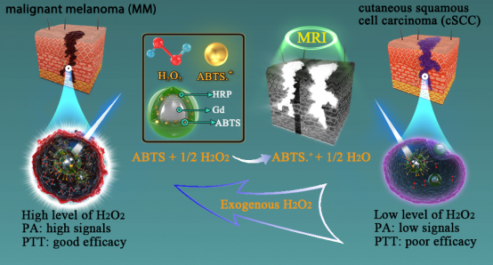 在继往研究的基础上,王秀丽教授及其团队结合自身学科特色,将诊疗一体化纳米探针转化应用于皮肤鳞癌及黑素瘤的诊疗研究。临床上,皮肤恶性黑素瘤与鳞癌生物学行为不同,恶性程度差异显著,这与其肿瘤微环境关系密切。肿瘤微环境中的H2O2和肿瘤的发生、发展和转移息息相关,因而,不同肿瘤中H2O2含量可能会有差别。那么,如何才能做到智慧微环境响应性精准治疗策略?张兵波教授团队基于前期工作基础,采用酶蛋白介导模拟仿生合成一种具有超灵敏H2O2响应性的iHRANPs智慧分子探针,利用H2O2触发HRP酶高效催化氧化底物ABTS成在近红外区(NIR)具有强吸收的氧化物形式ABTS•+。在 808 nm激光照射下,该探针可展现出优异的光声成像效应和光热转换效能。