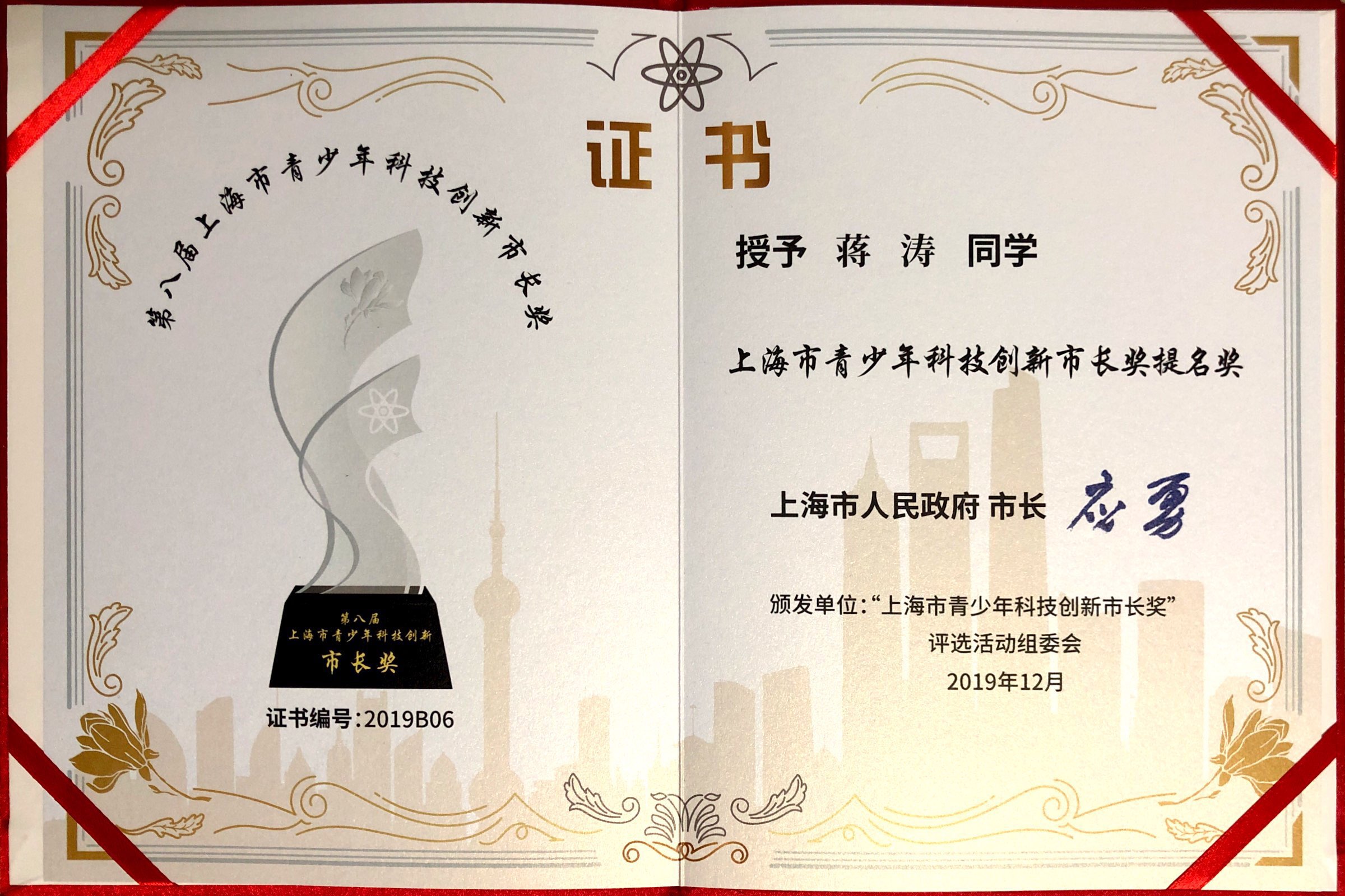 12月19日下午,第八届“上海市青少年科技创新市长奖”颁奖仪式举行,上海市委副书记、市长应勇为获奖者颁奖,并与大家亲切交流。来自我院的“上海市青少年科技创新市长奖”提名奖获得者本科生冯超博、博士毕业生蒋涛受邀出席。
