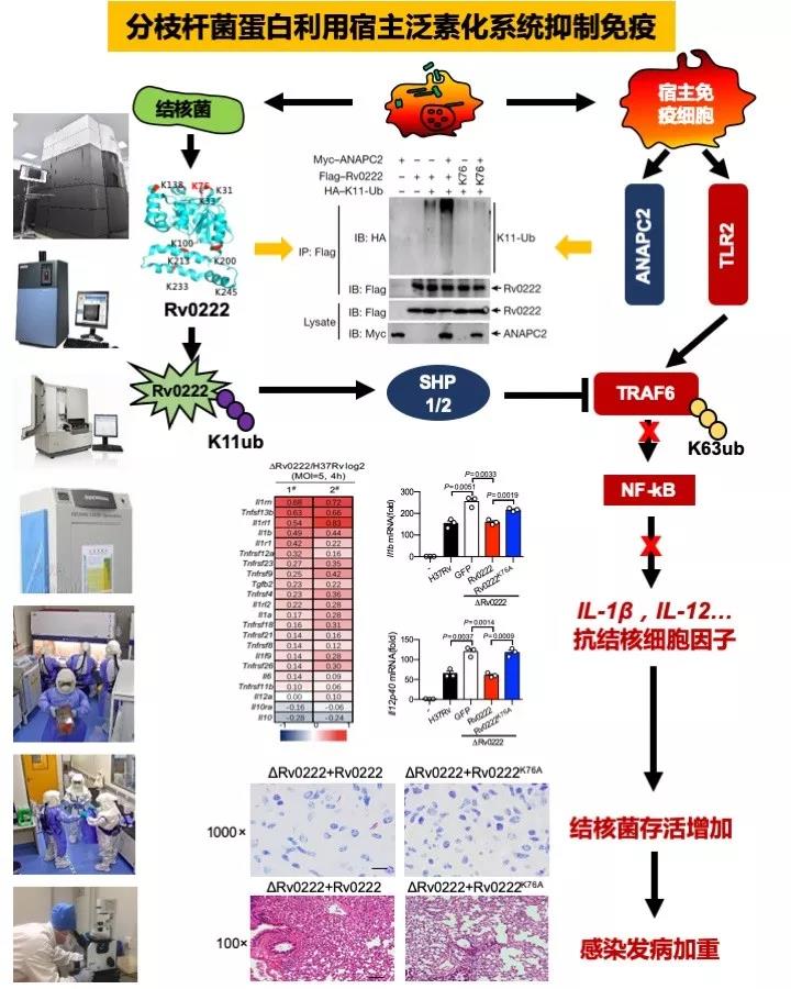 中国科学院院士赵国屏教授和中华医学会结核病学分会前主任委员、pg游戏电子模拟器附属上海市肺科医院结核病首席临床顾问专家肖和平教授表示,这项研究工作完整阐述了结核菌利用人体泛素化系统抵御人体免疫攻击的逃逸机制,这一对人体蛋白质修饰系统帮助结核菌感染致病新机制的发现,拓宽了我们对蛋白质修饰系统在感染性疾病调控中作用的视野。同时,研究者通过蛋白结构分析和功能探索,精准指出Rv0222毒力蛋白是在其76位点的赖氨酸上发生K-11泛素化修饰后发挥毒力,可以在后续研究中为新型抗结核药物的开发提供更精准的靶点。