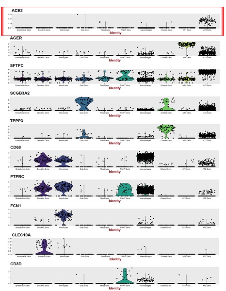 “ACE2受体就是病毒进入人体‘大门’。搞清楚这个‘门’开在哪里、开了多大,对于防止感染具有重要意义。”研究团队整合分析了公开数据库中近两年来积累的肺脏单细胞测序数据,发现ACE2在0.64%的肺细胞中表达,且80%以上都集中表达于II型肺泡细胞;表达ACE2的II型肺泡占其总数量的1.4%。在其他细胞类型如I型肺泡、支气管上皮细胞、成纤维细胞、内皮细胞和巨噬细胞中零星可见。而且通过对基因功能的分析,研究者还发现,这1.4%的ACE2+ II型肺泡细胞还表达至少20多个与与病毒组装复制相关的功能基因。