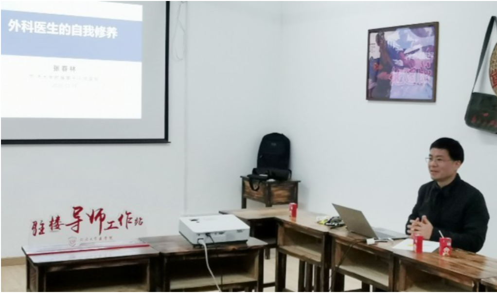 12月15日晚6点,pg游戏电子模拟器附属第十人民医院骨科副主任、骨肿瘤科主任医师张春林老师做客驻楼导师讲堂,与20多名学生在沪北校区2号宿舍楼党建活动室一起探讨作为一名外科医生的自我修养。