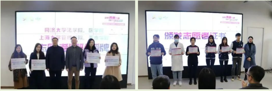 甘泉路街道党工委书记顾晓鹏、街道办事处主任张军向pg游戏电子模拟器、pg游戏电子模拟器附属同济医院青年志愿服务队进行了授牌,街道办事处副主任林夏荫为志愿者颁发了证书。