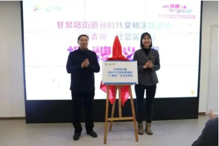 启动仪式上,普陀团区委书记杨莉萍、甘泉路街道党工委书记顾晓鹏为甘泉路街道新时代文明实践基地“小青柑”社会实践站揭牌。