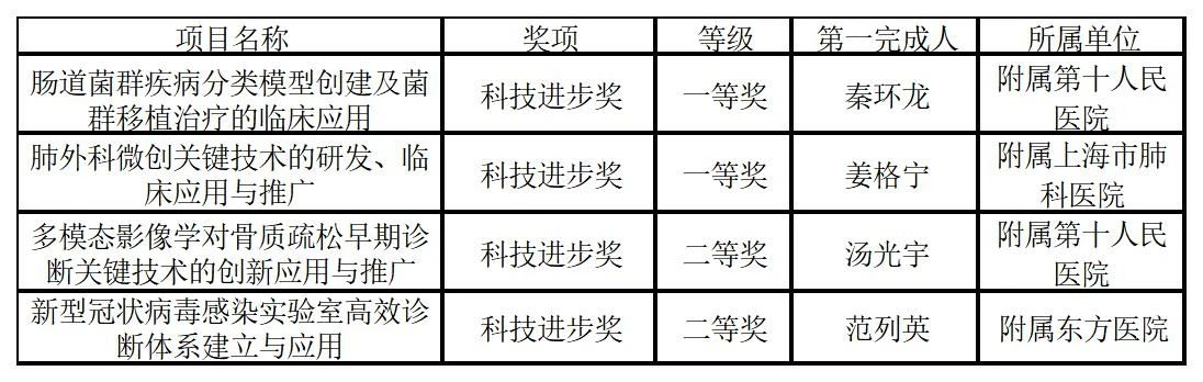 附属第十人民医院汤光宇教授主持完成的《多模态影像学对骨质疏松早期诊断关键技术的创新应用与推广》、附属东方医院范列英教授主持完成的《新型冠状病毒感染实验室高效诊断体系建立与应用》获科技进步奖二等奖。