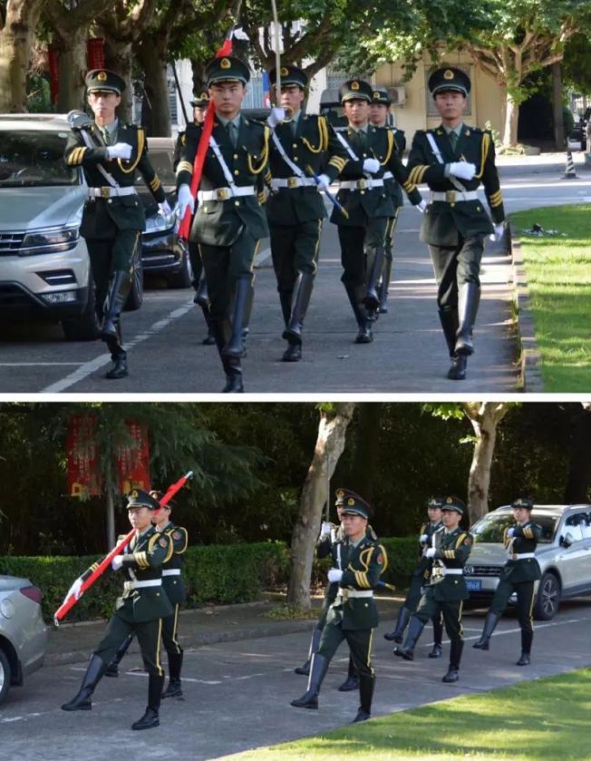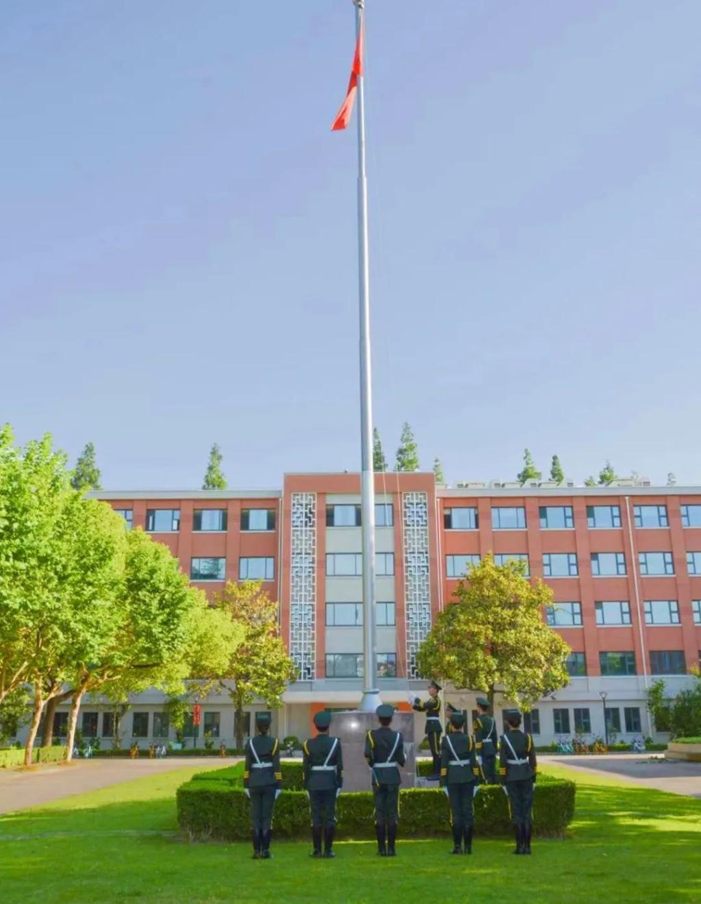 早上七点整,迎着朝阳,升旗仪式正式开始。国旗护卫队的同学们迈着整齐有力的步伐护送国旗来到升旗台下。“起来,不愿做奴隶的人们……”伴着慷慨激昂的《义勇军进行曲》,升旗手振臂一挥,鲜艳的五星红旗在晨曦的照耀下徐徐展开,在全体师生庄严肃穆的注目中冉冉升起,飘扬在校园上空。