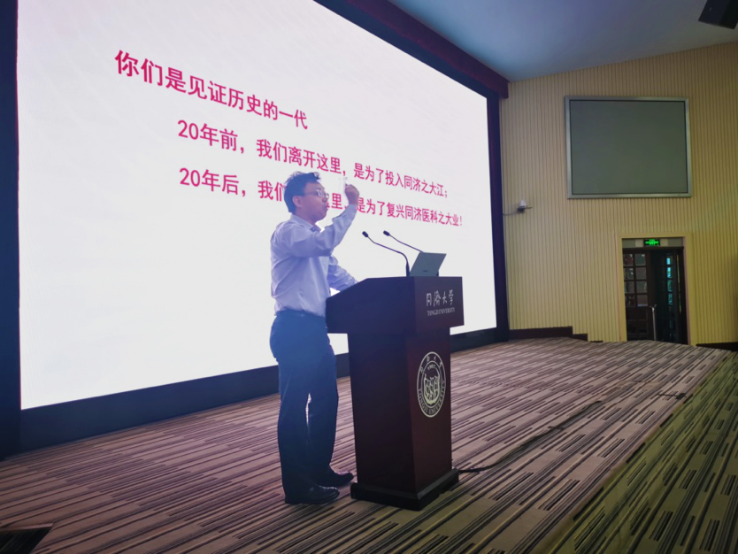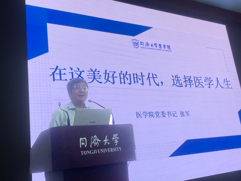 张军书记谈到,2020年新冠疫情暴发,在百年未有之大变局中,在世界政治经济产生巨大变化的当下,习近平总书记提出的“人民至上,生命至上”,彰显了每位医学人身上的重任,体现出医学生应当具有的使命与担当。他从怎样做好一个同济人、怎样当一个好医生、怎样做一个优秀的同医人三个方面,带领同学们回望学医初心,感悟同济情怀。张军书记强调,同学们是同济医学发展的见证者、践行者,号召同学们一起努力,成为祖国和社会的栋梁之才,同舟共济,再创同济医学的辉煌。