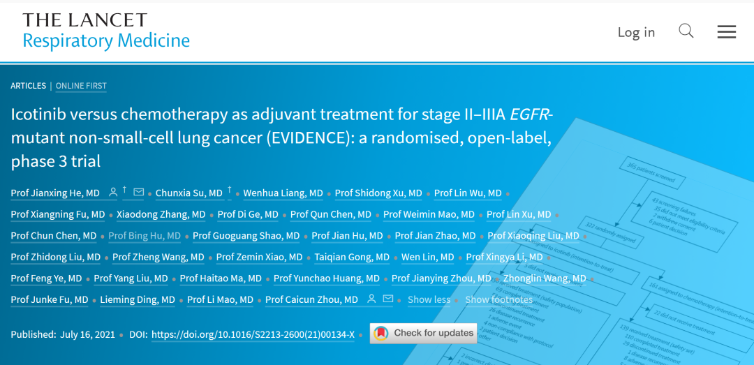 《柳叶刀·呼吸医学》(The Lancet Respiratory Medicine,影响因子30.143)是《柳叶刀》专业系列子刊之一,延续了《柳叶刀》出版高影响力医学实践内容的传统,主要刊发呼吸医学和重症监护等领域文章。业内专家表示,此次EVIDENCE研究结果在《柳叶刀·呼吸医学》的发表,标志着以周彩存教授为代表的中国研究者在相关疾病治疗领域的临床研究能力达到了国际先进水准,同时进一步证实了该治疗方式在辅助治疗阶段的有效性和安全性,扩大了EGFR-TKI的适应症范围,提升了中国专家带领的研究团队的国际知名度和影响力。目前埃克替尼已经获批术后辅助适应症,期待将惠及更多中国患者。