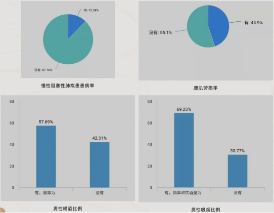 团队成员在多地取样,进行了一次中老年人健康情况小调查,调查内容包括不良嗜好和常见慢性病两部分。不良嗜好包括抽烟、喝酒、翘二郎腿、嚼槟榔等四项,常见慢性病包括高血糖、高血压、慢性阻塞性肺疾病、腰肌劳损等四项,部分调查结果如下: