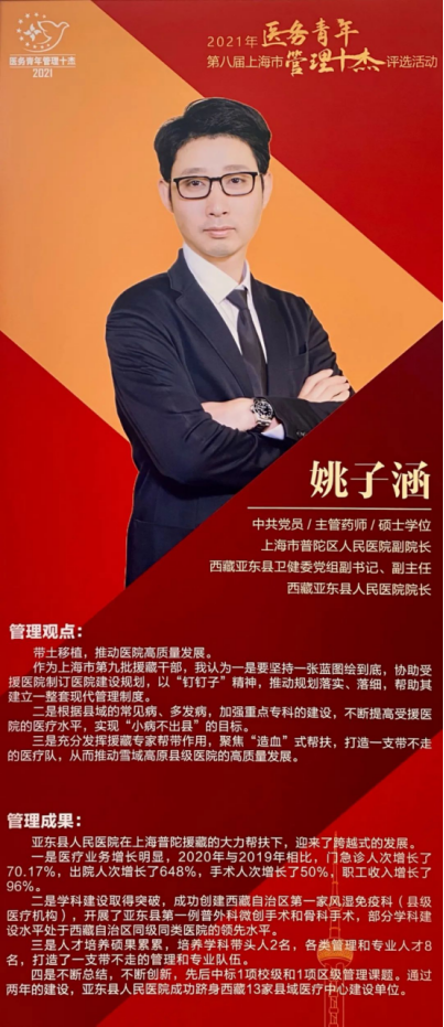 上海市医务青年“管理十杰”是上海市卫生健康行业青年管理人才的最高奖项,自1997年起设立,每三年评选一次。评选旨在挖掘和推举一批在医药卫生体制改革和卫生管理实践中勇立潮头的青年管理英才,激励全行业青年以高质量管理助推卫生健康行业高质量发展和现代化医院管理制度建设,拓展管理思维、创新管理模式,发掘和培养优秀青年管理人才,不断提升服务模式创新度、服务对象感受度、服务品牌美誉度和服务功能辐射度,以人民健康为中心提供高品质健康服务,全面提升城市软实力。