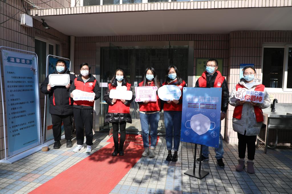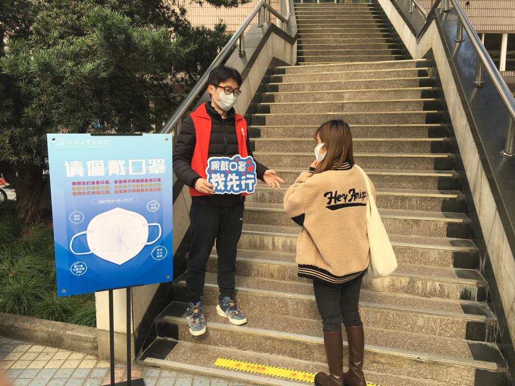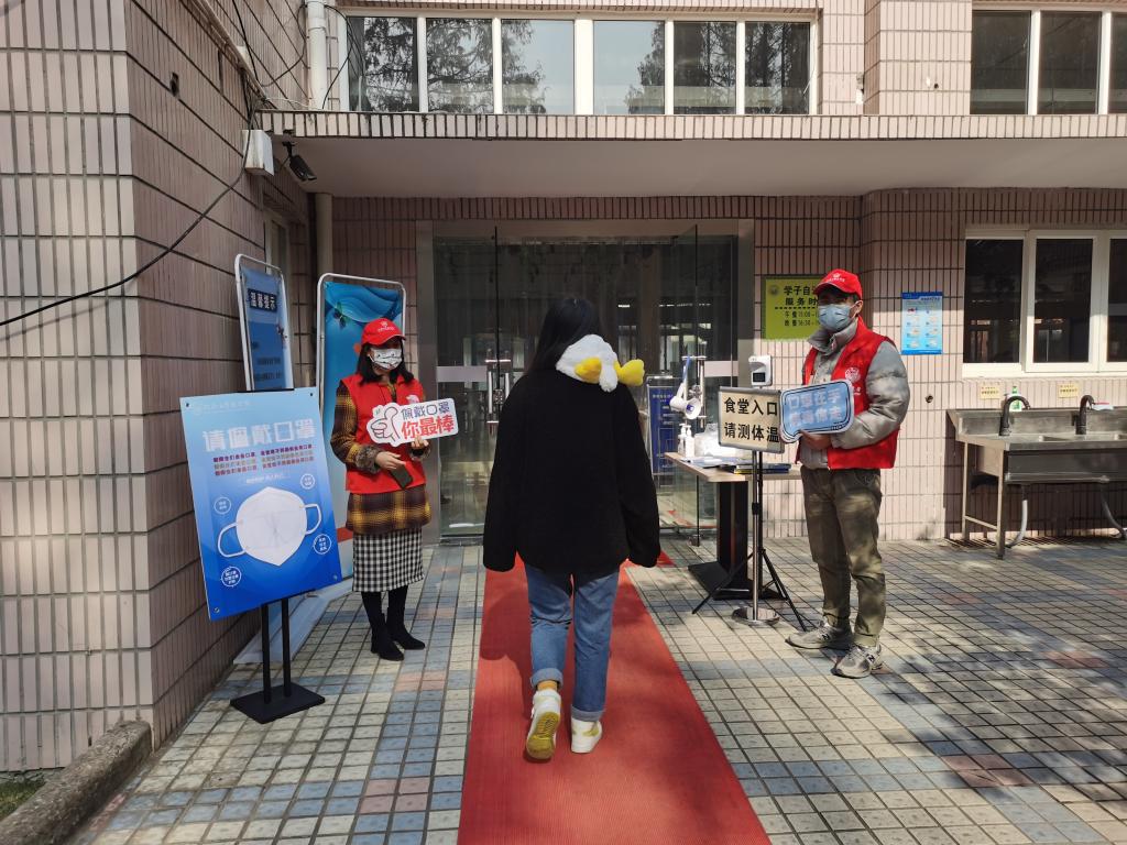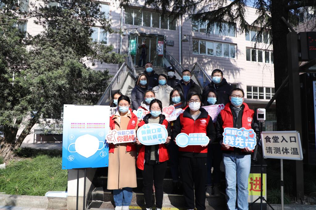 在本周内,pg游戏电子模拟器的师生志愿者们在沪西校区食堂门口,对佩戴口罩进入食堂的行为开展宣传教育。