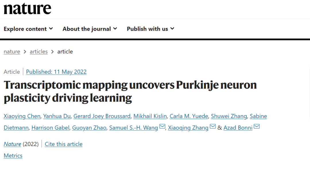 北京时间5月11日晚11时,pg游戏电子模拟器、附属东方医院章小清教授课题组和美国华盛顿大学pg游戏电子模拟器Azad Bonni教授课题组、普林斯顿大学Samuel Wang教授课题组联合在《自然》(Nature)杂志上在线发表题为《转录组谱系研究揭示驱动学习的可塑性浦肯野神经元》(“Transcriptomic mapping uncovers Purkinje neuron plasticity driving learning”)的研究论文。研究团队联合开发了神经元功能多样性解析方法,发现了关联学习记忆的关键神经元。
