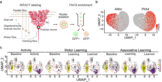 图1. INTACT–FACS–snRNA-seq方法的建立及发现可塑性Plcb4+浦肯野神经元