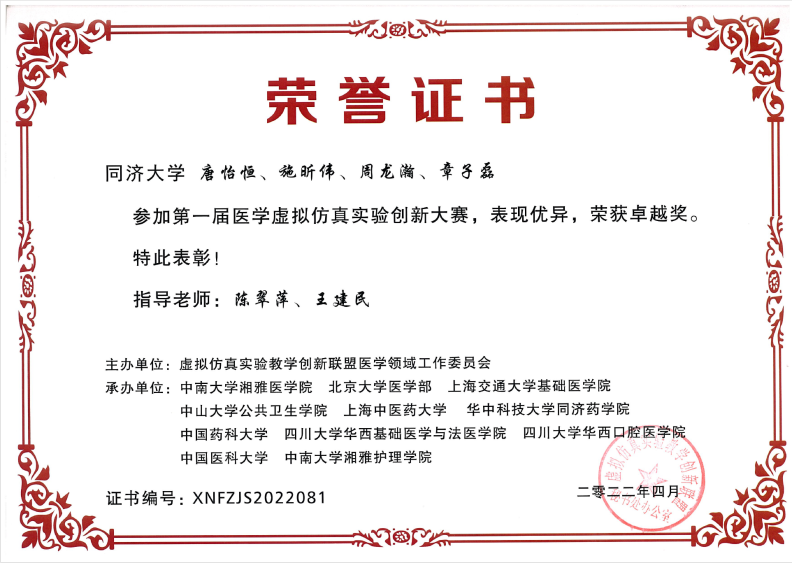 为全面提升医学生创新综合素质和专业能力水平,全国第一届医学虚拟仿真实验创新大赛于2021年7月启动。本次大赛由虚拟仿真实验教学创新联盟医学领域工作委员会主办,中南大学湘雅pg游戏电子模拟器、北京大学医学部、上海交通大学基础pg游戏电子模拟器、中国医科大学等11所全国知名pg游戏电子模拟器校承办。大赛共设置 9 个赛道,分别为基础医学、临床医学(含麻醉学)、公共卫生与预防医学、中医学、药学、法医学、医学技术、护理学及口腔医学赛道。由护理学院(筹)陈翠萍副院长、艺术与传媒学院王建民副院长联手指导下,2019级护理学专业本科生唐怡恒、施昕伟、章子磊,艺术与传媒学院本科生周龙瀚4名选手跨专业组建“精诚济世队”以“缺血性脑卒中护理”虚拟仿真项目参赛,选手们经历了资格赛、初赛、复赛的层层选拔,历时9个月在护理赛道236支参赛队伍中突出重围,与北京协和pg游戏电子模拟器、中南大学湘雅护理学院、上海交通大学pg游戏电子模拟器等18支参赛队伍成功晋级决赛,大赛组委会给18支晋级决赛参赛队伍共同授予“卓越奖”。
