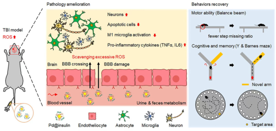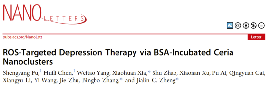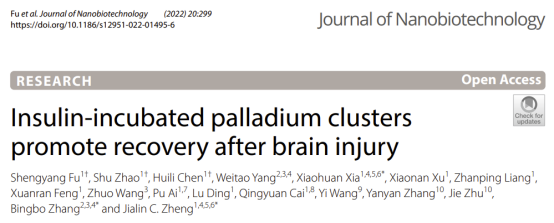 郑加麟教授、张兵波研究员和夏骁寰研究员团队以活性氧(ROS)为靶点,通过一种方便、绿色、高效的天然蛋白(牛血清白蛋白、胰岛素等)孵育策略合成了超微尺寸CeO2@BSA和Pd@insulin纳米簇,有效突破了现有纳米酶的不足之处,并在创伤性脑损伤和抑郁症等急慢性中枢神经系统疾病小鼠模型中验证了CeO2@BSA和Pd@insulin纳米簇对神经功能的修复作用和对神经炎症与损伤的改善效果。该工作通过新型纳米酶合成技术,获得了一系列新型抗脑损伤和抑郁的纳米药物,为推动纳米酶的临床转化和应用提供了理论基础与技术储备。