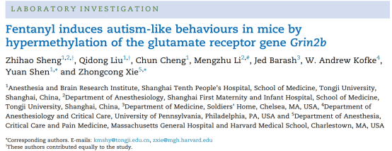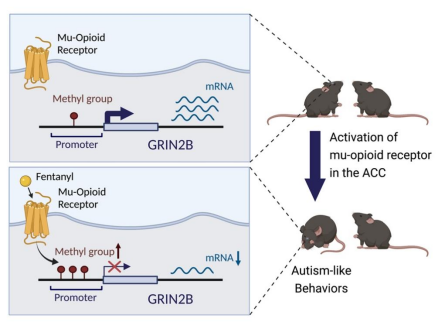 该研究揭示了多次芬太尼暴露通过激活ACC中mu阿片受体,导致该区域NMDA受体Grin2b基因超甲基化及蛋白表达降低,造成幼年小鼠远期出现自闭症样行为。需要特别指出的是,该研究结果均是在实验动物上的发现,现阶段尚无证据表明临床使用芬太尼可导致婴幼儿出现同样的远期自闭症样行为。