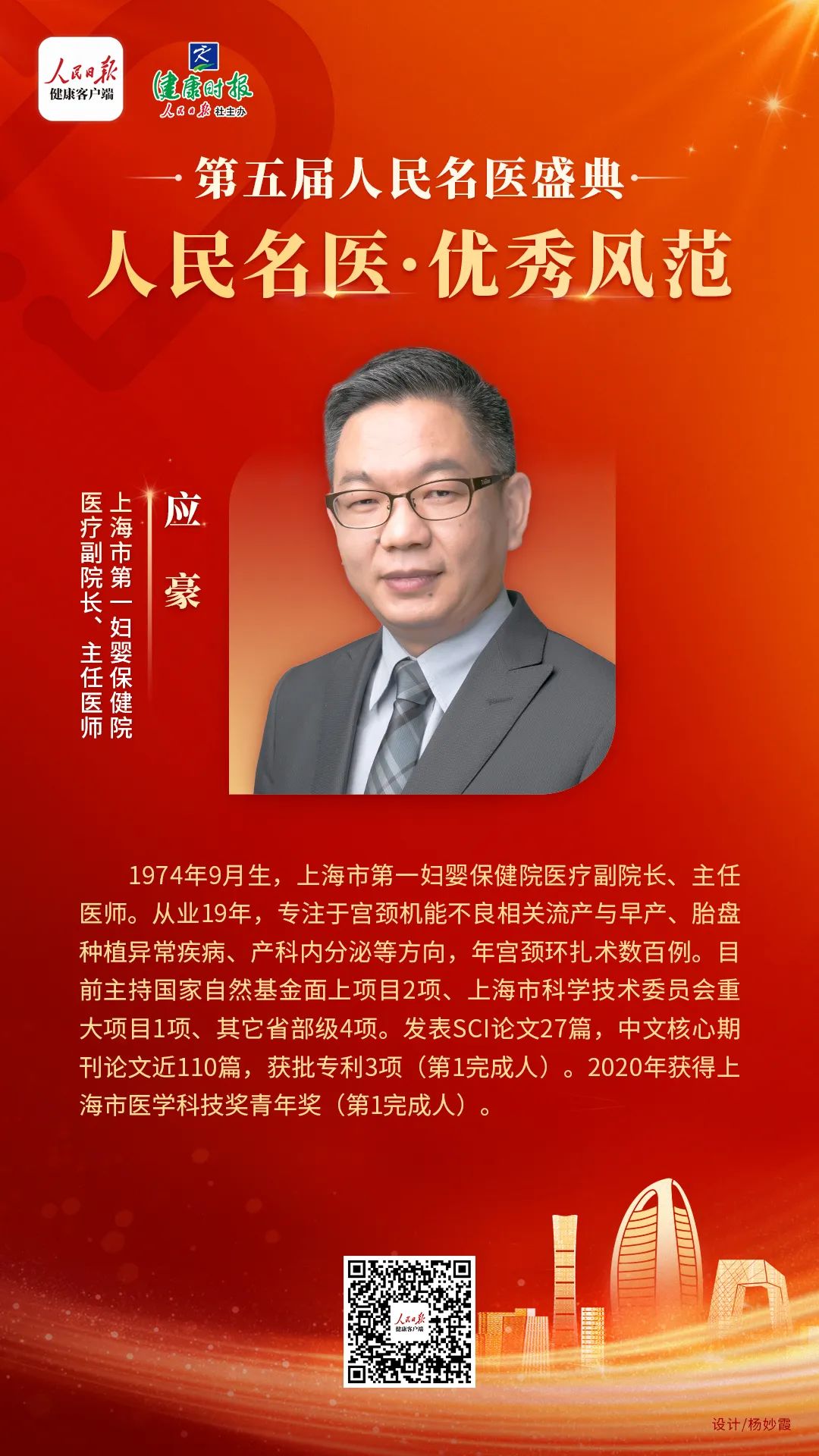 上海市第一妇婴保健院医疗副院长、主任医师。从业19年,专注于宫颈机能不良相关流产与早产、胎盘种植异常疾病、产科内分泌等方向,年宫颈环扎术数百例。目前主持国家自然基金面上项目2项、上海市科学技术委员会重大项目1项、其它省部级4项。发表SCI论文27篇,中文核心期刊论文近110篇,获批专利3项(第1完成人)。2020年获得上海市医学科技奖青年奖(第1完成人)。