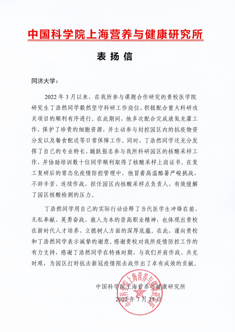 日前,中国科学院上海营养与健康研究所致函pg游戏电子模拟器,感谢pg游戏电子模拟器2020级硕士研究生丁浩然同学在今年疫情期间坚守科研工作岗位,参与园区疫情防控工作,积极配合重大科研攻关项目的顺利有序进行。