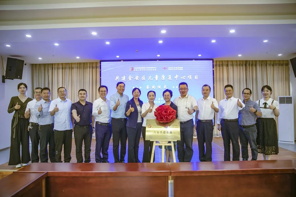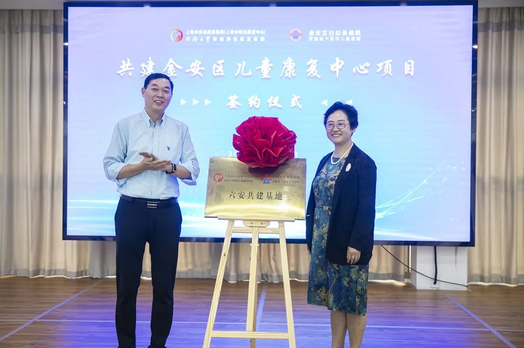 附属养志康复医院儿童康复中心主任、学科带头人敖丽娟与六安市卫健委副主任张劲松一同为共建基地揭牌。